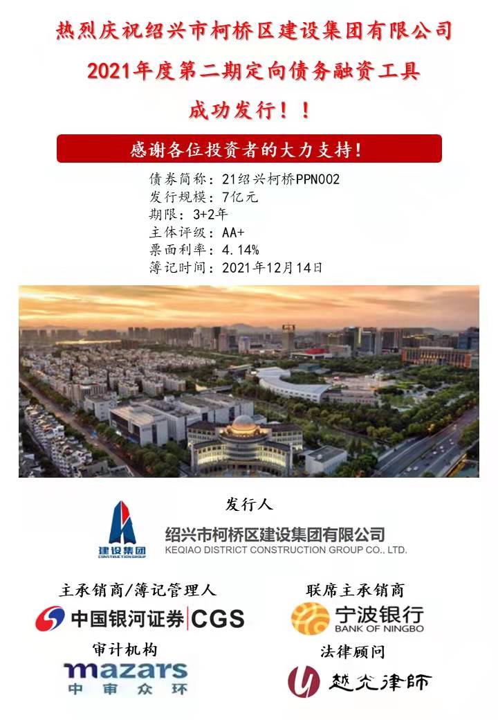 1214日,紹興市柯橋區(qū)建設(shè)集團有限公司2021年第二期定向債務(wù)融資工具成功簿記建檔,規(guī)模7億元,期限3+2年,AA+主體無擔(dān)保,票面利率4.14%。